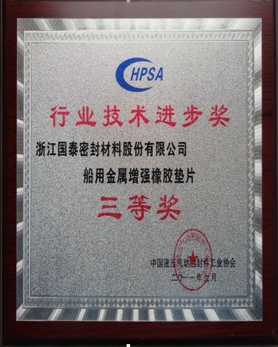 2011年9月,中国液压气动密封件工业协会发文,公布了2011年获得行业技术进步奖的企业项目成果名单。在评出的49项获奖成果中,yl7703永利集团密封囊括其中2项:环保型无石棉密封板(垫)被评为二等奖;船用金属增强橡胶垫片被评为三等奖。